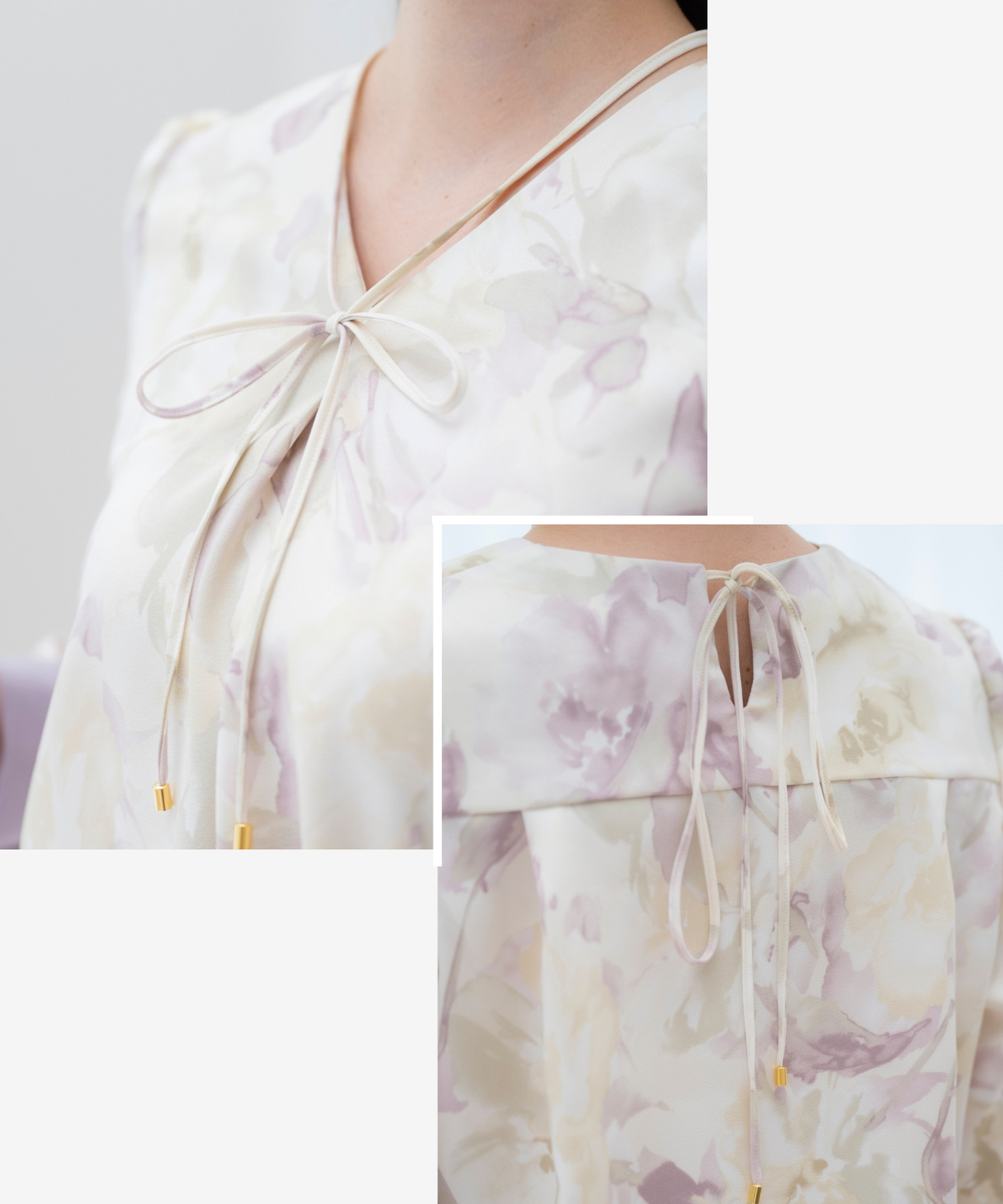 生成り色のベースに、濃淡の異なるくすみ系パープルが散りばめられたデザイン。甘すぎず、大人の女性にぴったりの落ち着いた雰囲気です。