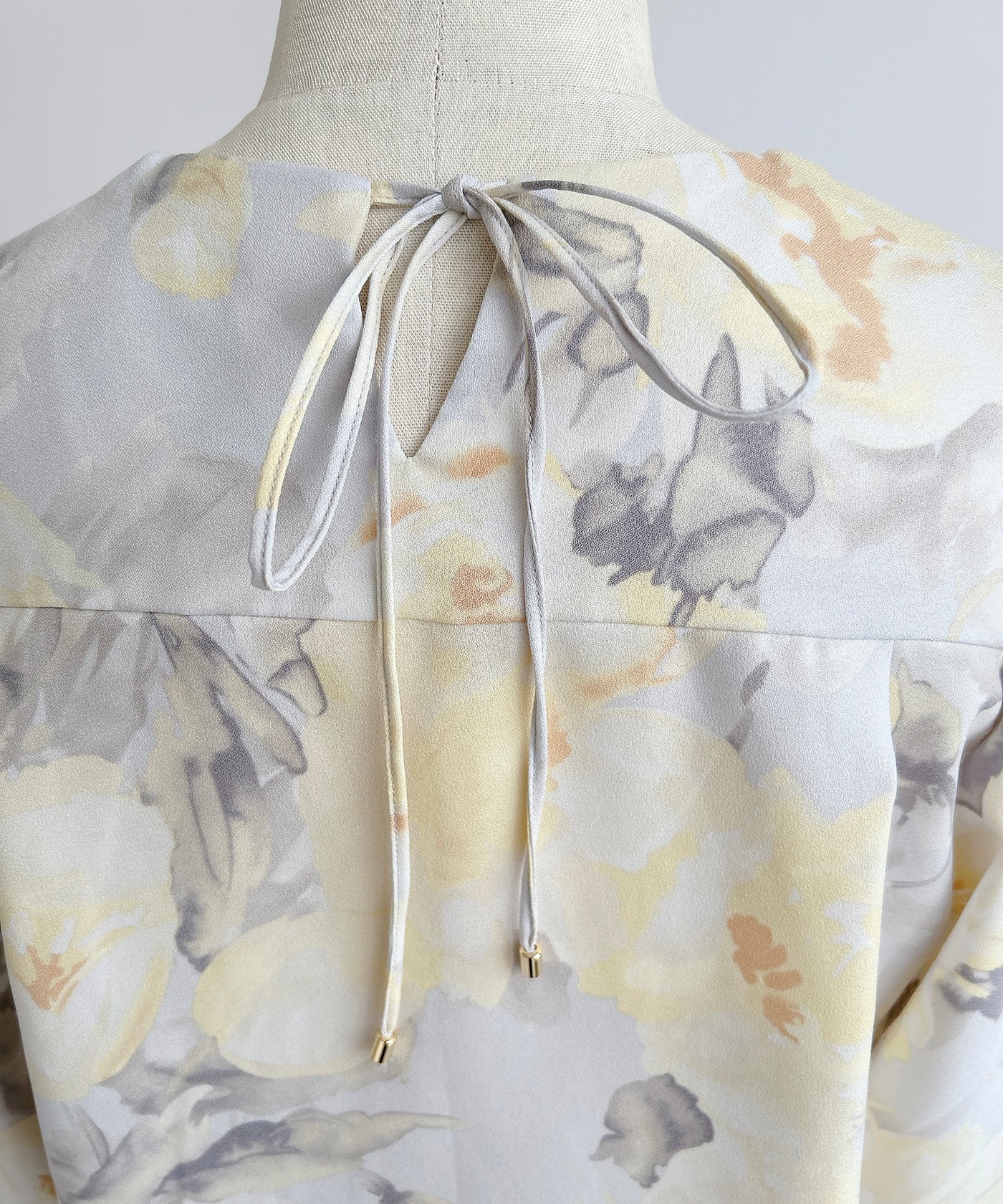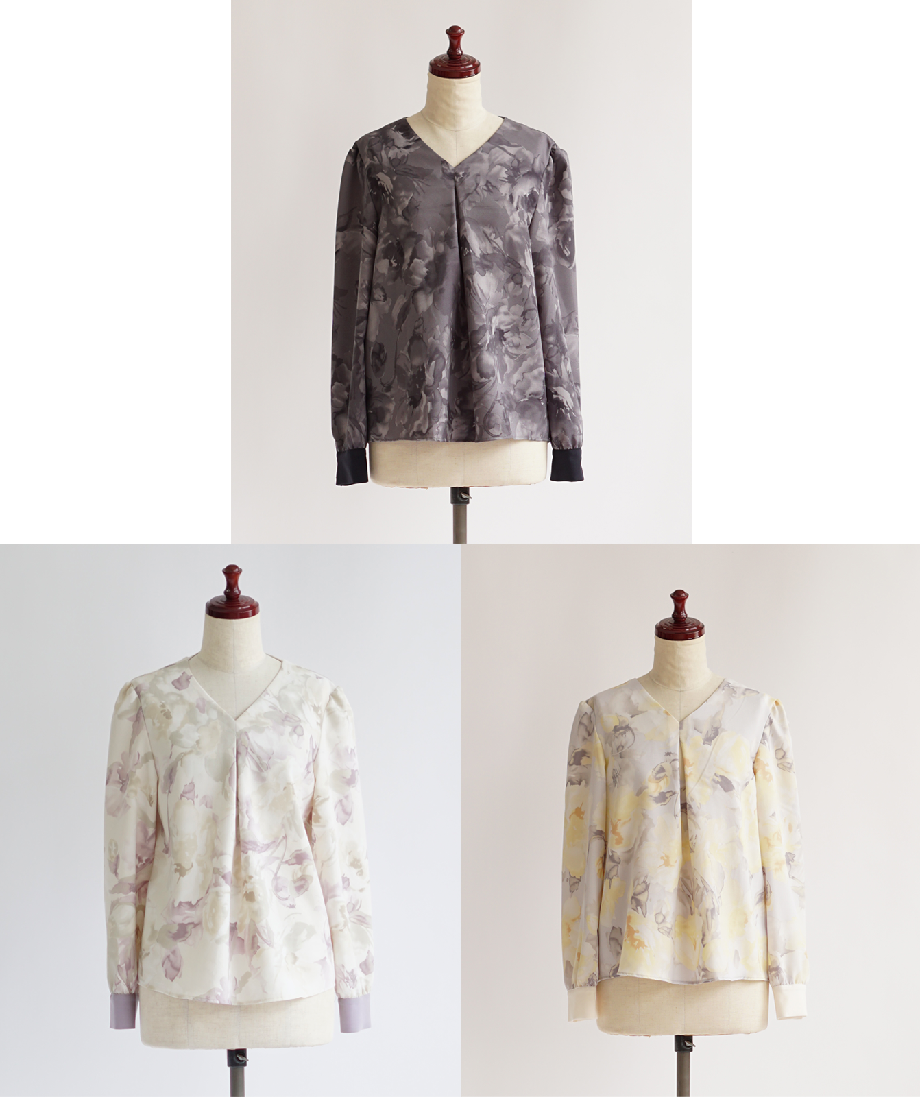 濃淡の異なるグレーを水彩絵の具のように重ねた、控えめな花柄デザイン。大人の上品さを演出します。