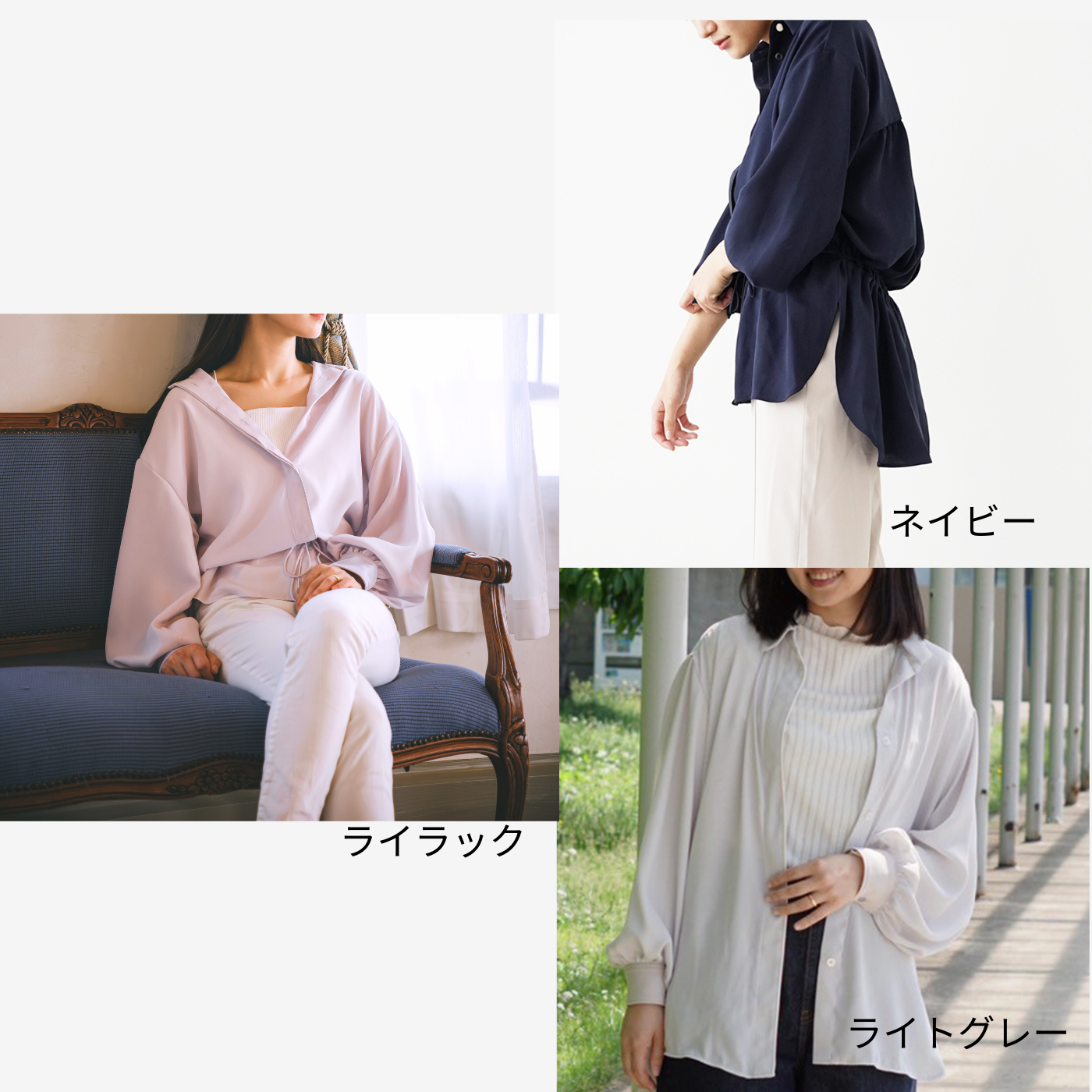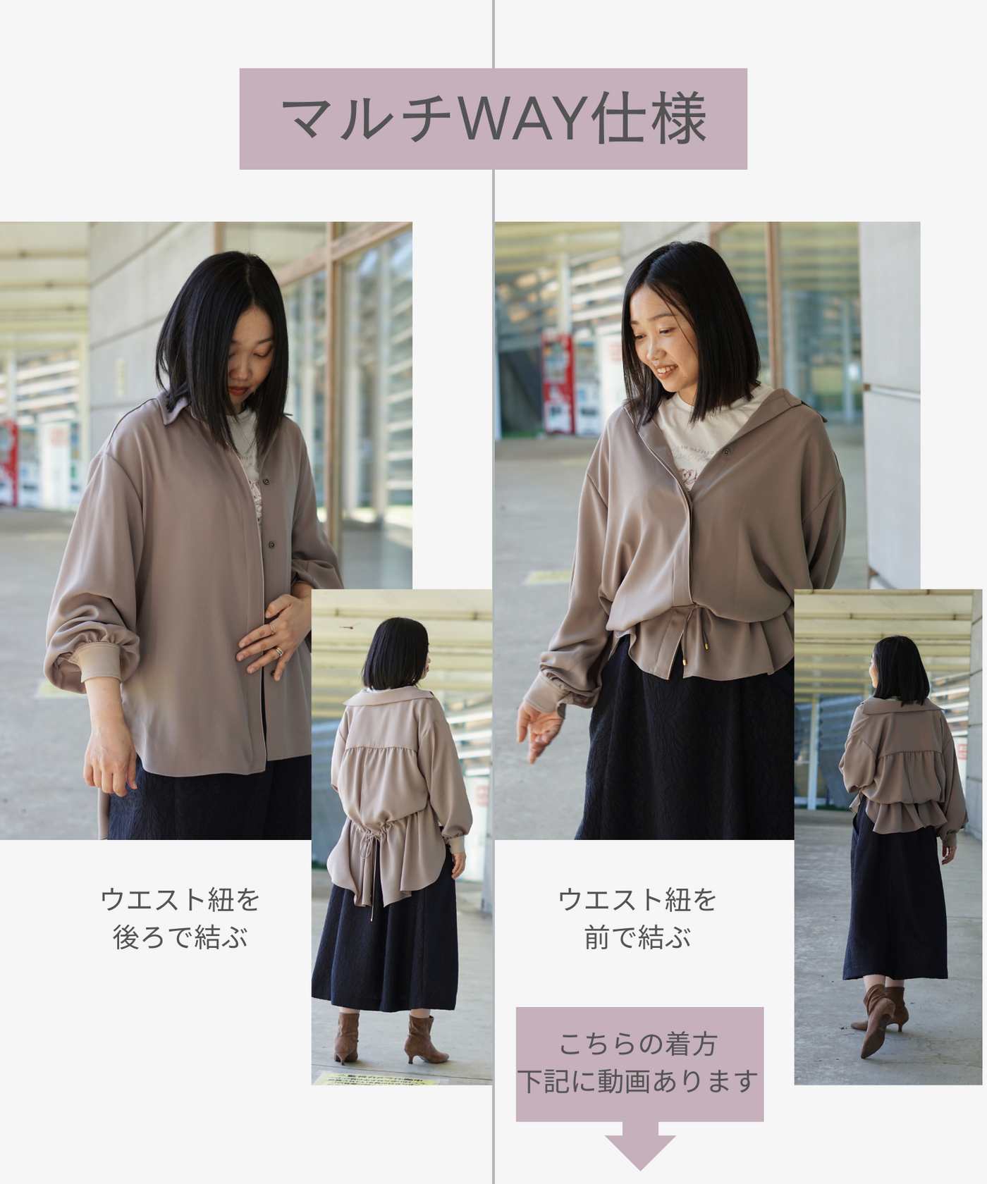 ギャザーを寄せてウエスト紐を後ろで結ぶと、お尻が隠れる長めの丈のシャツとなります。