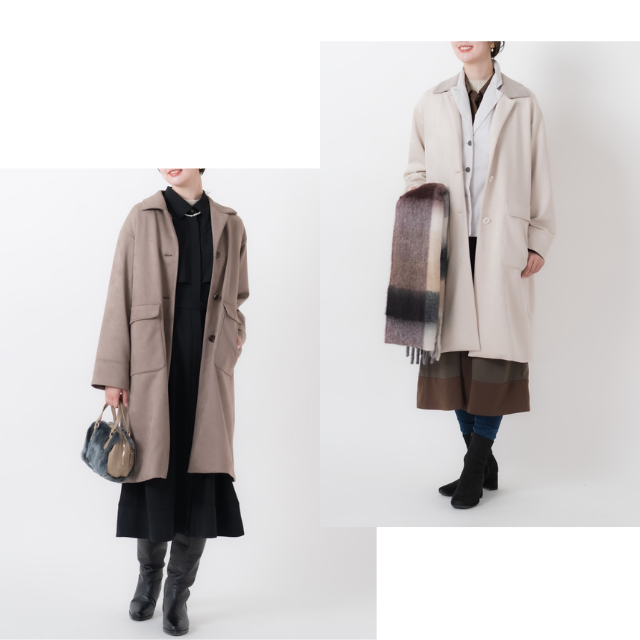 寒い季節に映える顔回りがパッと華やぐ明るさのアイボリー。ワントーンコーデも◎インナーに濃色を合わせても良し。少し灰色みがかっているので大人の女性も取り入れやすいカラーです。
