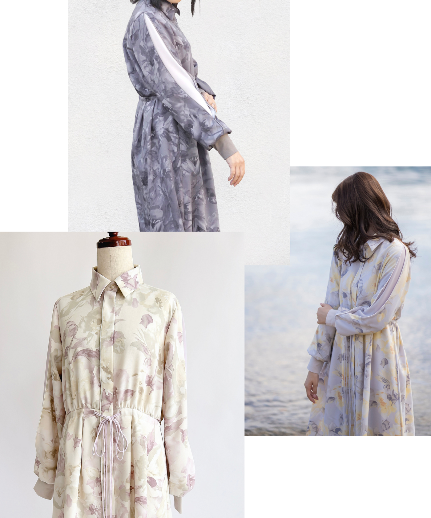 2枚仕立ての袖と前開き部分に施された光沢感のあるライン、華奢なウエスト紐..