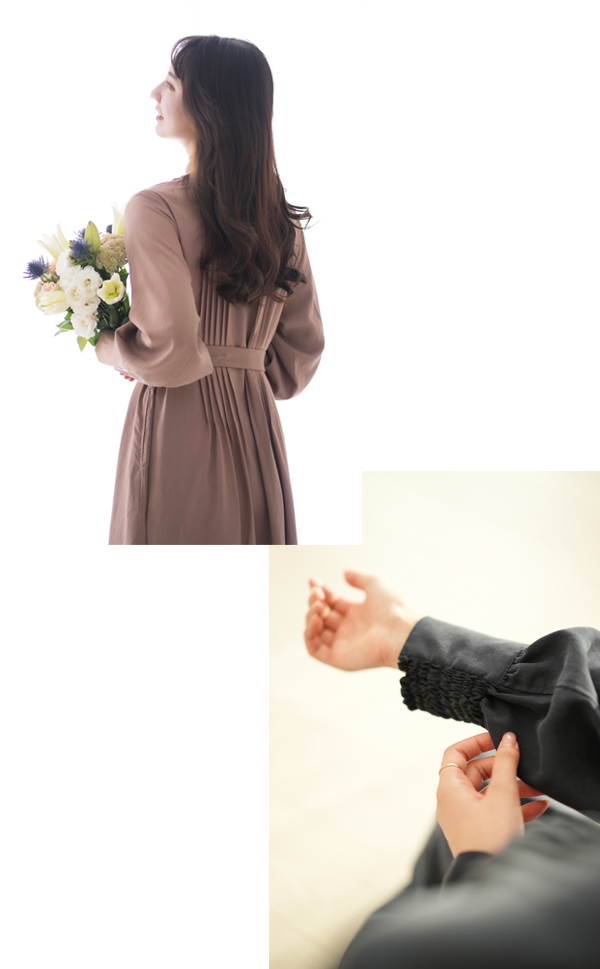 柔らかく繊細なニュアンスを感じさせるカラーで、ワンピースのピンタックやフレアーの陰影を美しく映し出します。