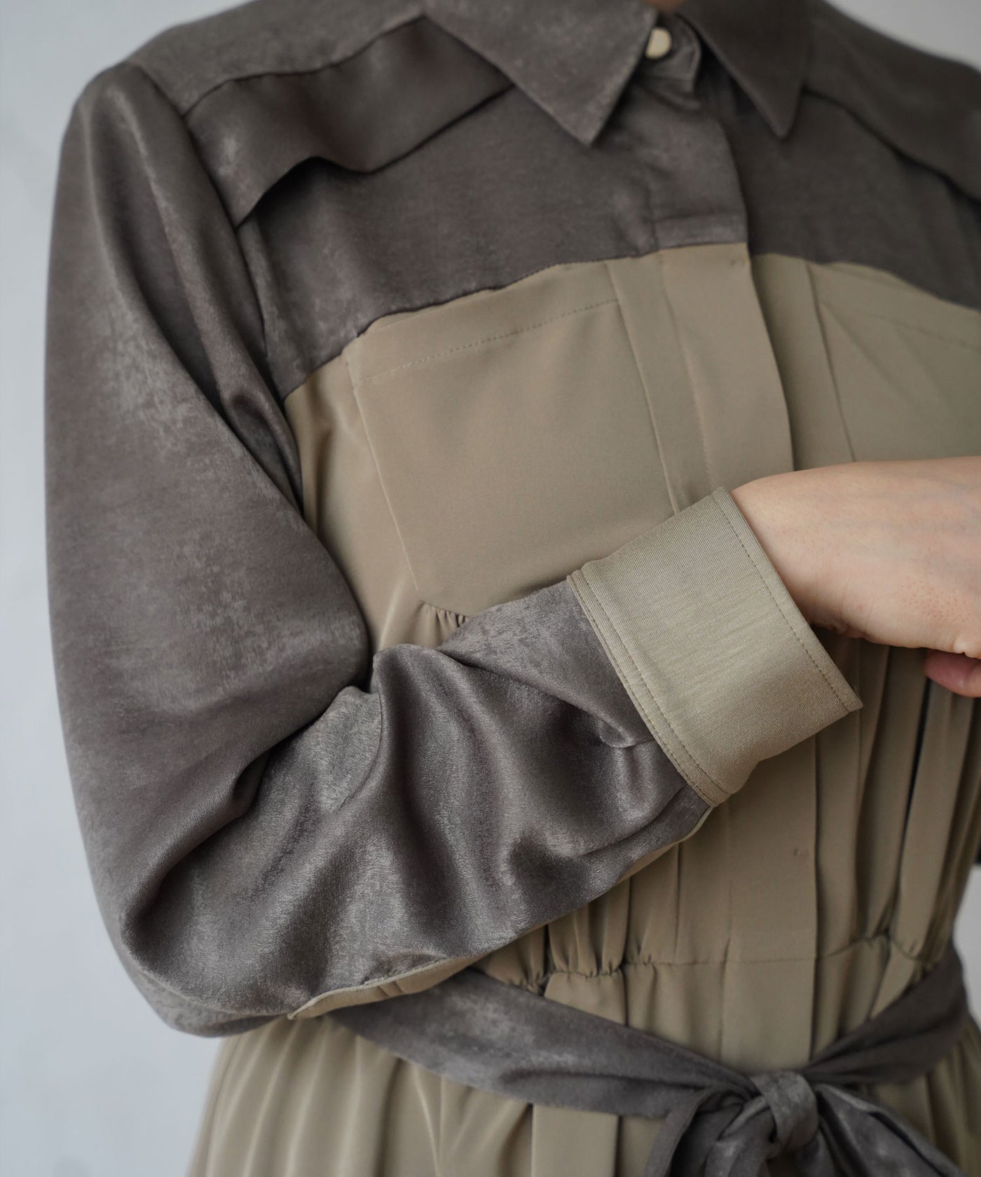 肩下まではスエード調の表情がある生地、胸より下にはさらっとしていて程よい光沢感と落ち感がある生地、更に袖口にはストレッチ素材を使用しています。