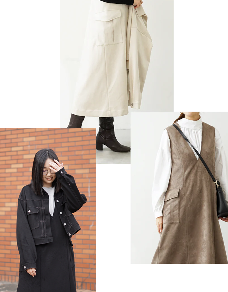 触り心地抜群!高級感たっぷりな柔らかく滑らかなスエード素材を使用して、ジャンスカとジャケットを作りました。